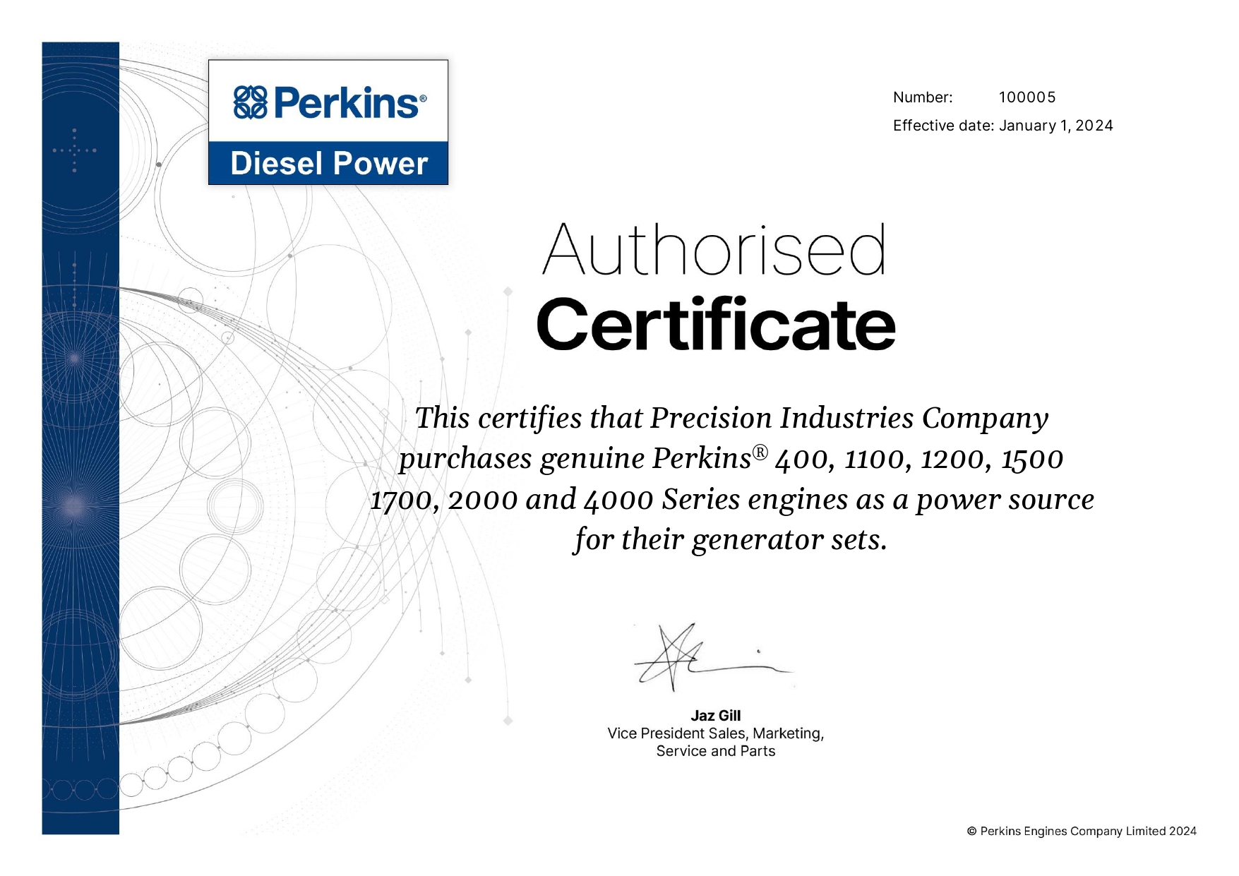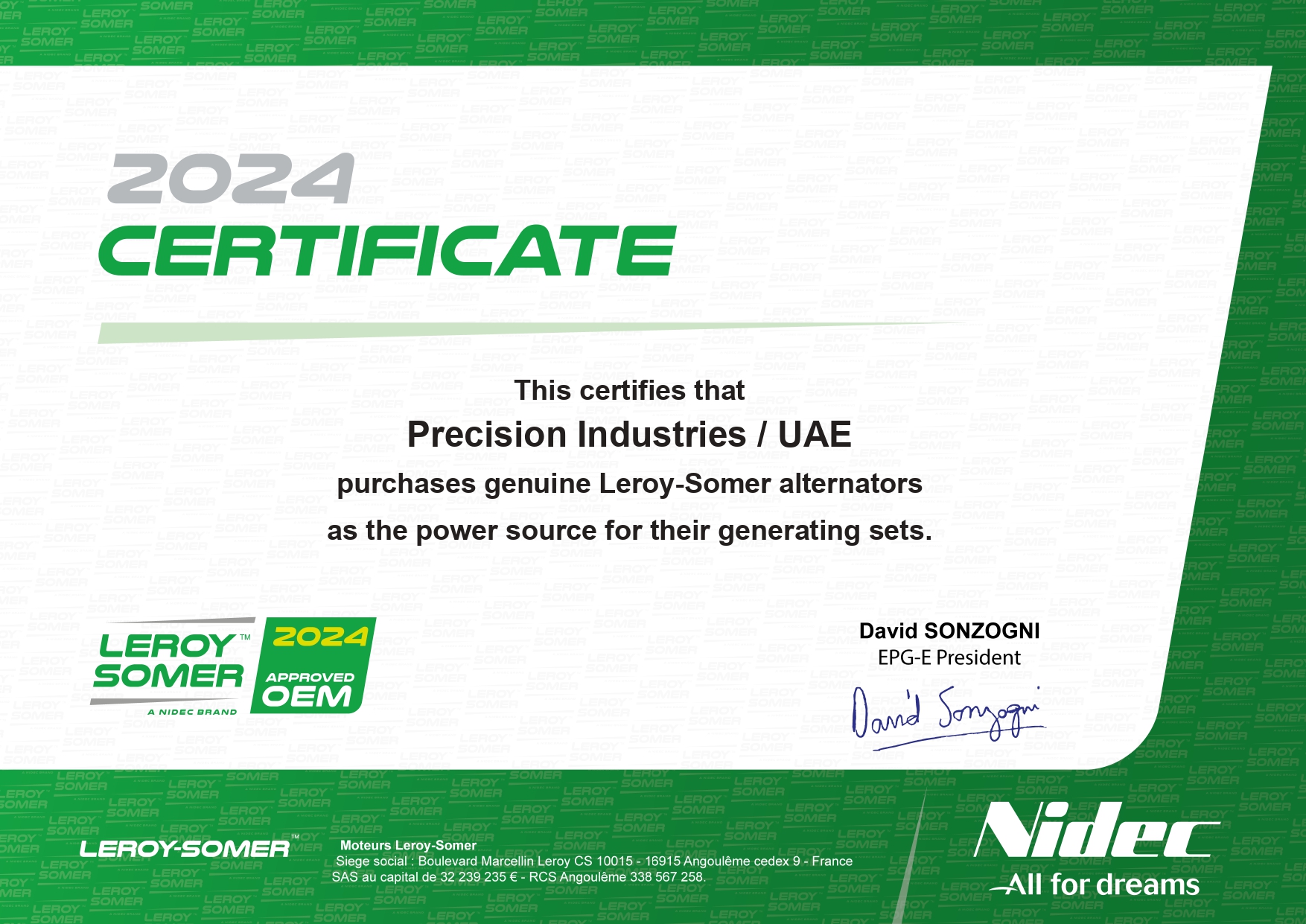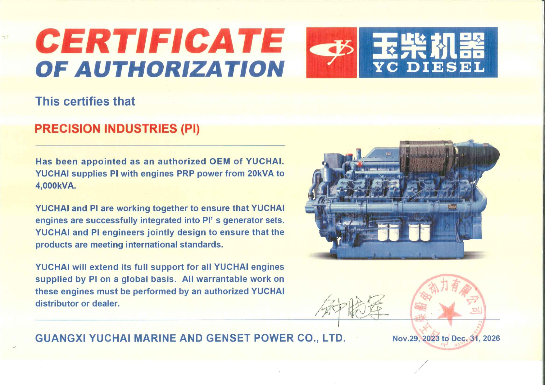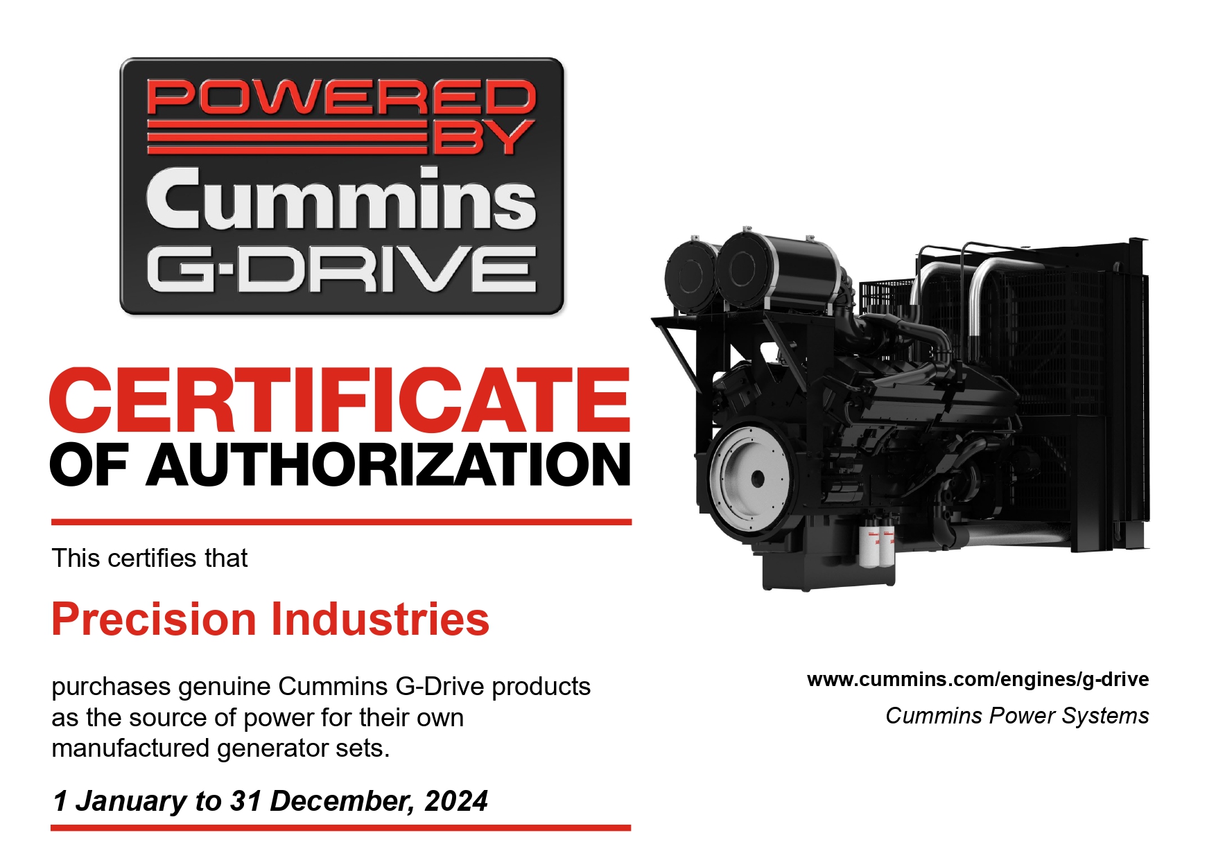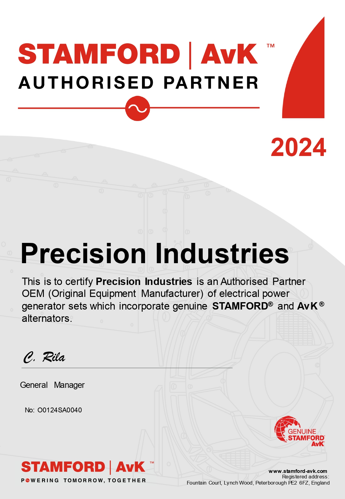 This certificate confirms that Precision Industries is an officially authorized Stamford partner, qualified to supply, integrate, and support Stamford alternators according to OEM specifications.